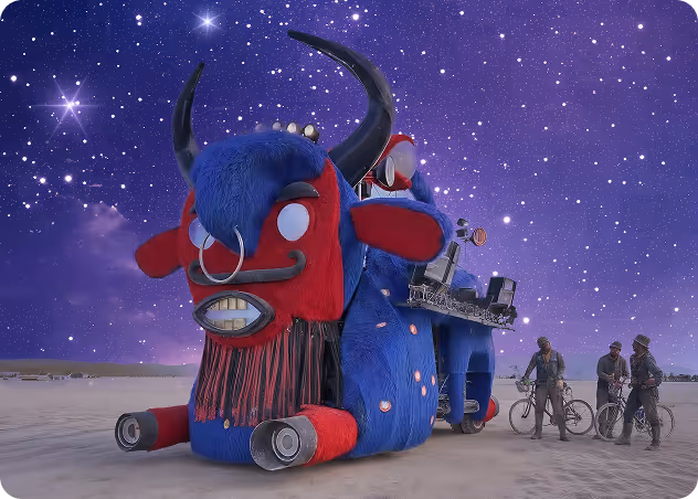 She provides shelter, a moving sanctuary where burners can rest, connect, and find respite from the elements. Inside her protective shell, cushioned benches offer comfort while the desert rages outside.